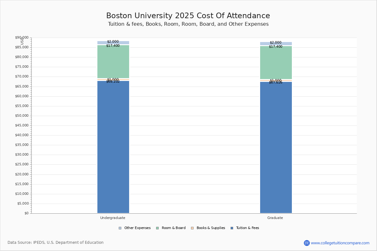 Boston University Tuition & Fees, Net Price , For graduate programs, its 2024 graduate school tuition & fees is $64,712.